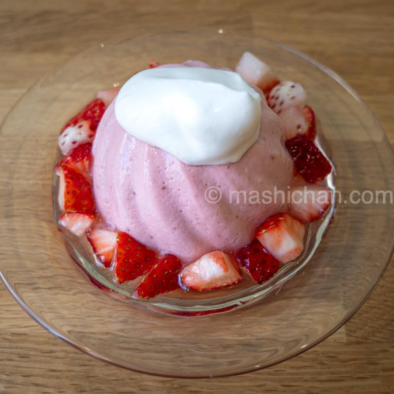 美しいピンクの苺のババロアとその周りには、シロップ漬けかな、フレッシュな苺。