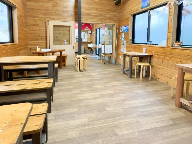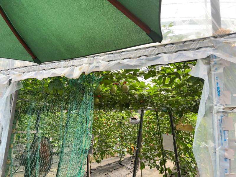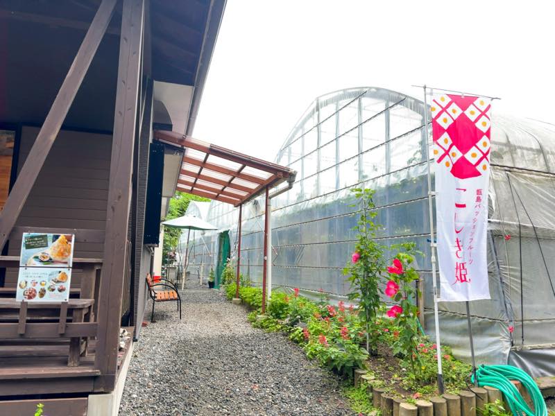 パッションフルーツのビニールハウスの横にロッジ風のカフェがあります。