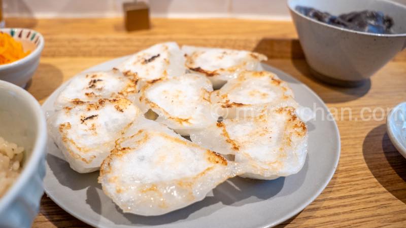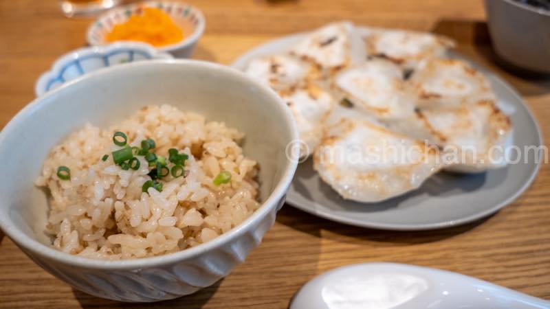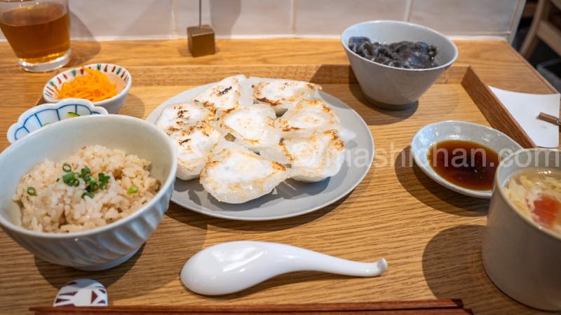 前菜2種+スープ+お出汁ごはん付き 名物の水晶餃子8個と水餃子4個の両方を楽しめるセット。
